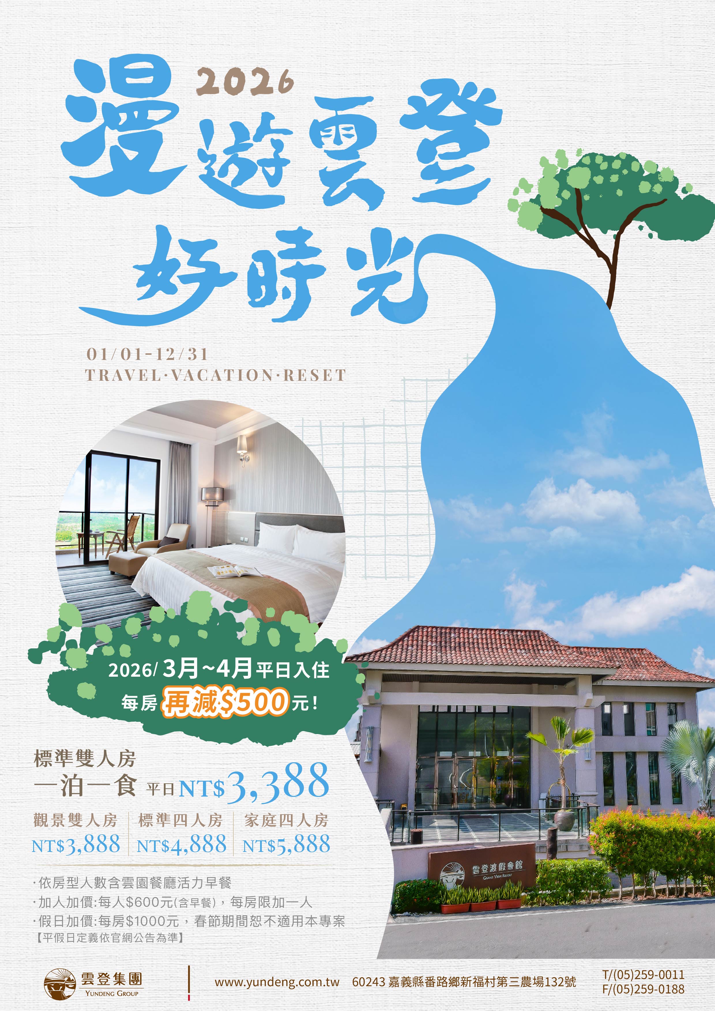 ※2026/3月-4月平日入住每房再減$500元(每房只要$2,888起)。